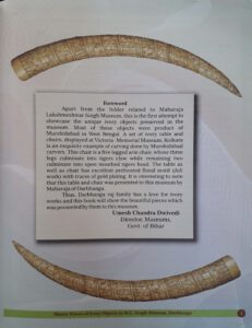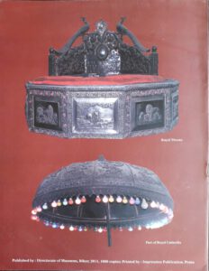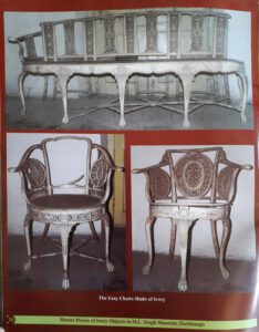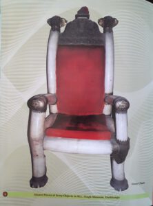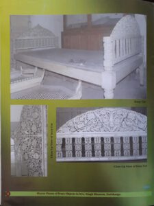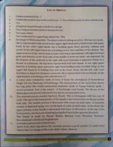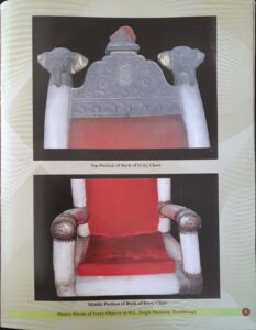 - Hall Number 1: This hall is known as Raj Singhasan Kash. Royal throne of Maharaj Rameshwar singh jee has been placd in this Hall. This throne is symbol of Power, wealth and dignity of the royal family. It is made of gold, silver and precious stones. Besides royal throne, silver made Palang(BED), Nalki and a number of other such items has also been placed in this hall which are pleasant memory of yester years of royal family. Royal throne and Silver Bed are unique examples of Sculptural excellence.
