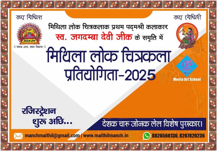 Mithila Folk Art Competition 2025 :: मिथिला लोक चित्रकला प्रतियोगिता 2025 मिथिला पेंटिंग के सिद्धहस्त कलाकार मिथिला पेंटिंग मे पहिल पद्मश्री स्व. जगदम्बा देवी के स्मृति मे आयोजित होयत।