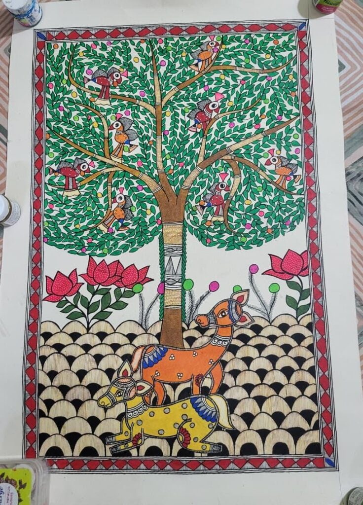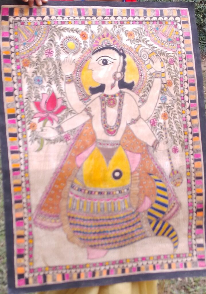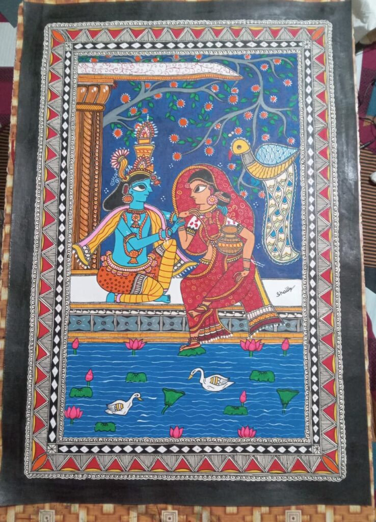 मैं अंजली नयन मिथिला पेंटिंग करती हूं। ओर साथ साथ टिकुली पेंटिंग भी करती हूं । मेरी अभिरुचि टेराकोटा, और एंब्रायडरी में भी है, और करती भी हूं। वैसे तो मेरी रुचि कलाकारी के प्रति बचपन से ही थी , और किया भी बहुत। सबसे पहले मैने कोहबर ही बनाया था । लेकिन मेरी अभ्यास किसी कारणवश २००८ में ही छूट गयी था। और वापस मैने २०२१ से अभ्यास शुरू किया। मैने ललित कला भवन में प्रदर्शित रूट टू रूट कोहबर प्रदर्शिनी में अपनी सहभागिता दिखाई थी। और बहुत ही अच्छी प्रदर्शिनी रही। लोगों ने बहुत सराहा भी। और बहुत कुछ सीखने को मिला। मैं चाहती हूं कि अपने नित्य अभ्यास से नई नई आध्यात्मिक, प्राकृतिक , कल्पनाओं पर आधारित चित्रकारी करूं। इस मैथिल मंच के साथ जुड़कर अपनी कला को प्रदर्शित करूं। सीखने की चाह को आगे बढ़ाते हुए आभ्यसरत रहूं।🙏🙏