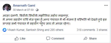 ओना त ‘चीनी वायरस- कोरोना’ सँ एहि विश्वव्यापी लड़ाई में पूरा देश एकजुट भय योगदान दय रहल अछि, सबगोटे अपन-अपन स्तर पर किछु ने किछु कय रहल छथि। एहन समय में बात उठैत रहल छल जे जनप्रतिनिधि सब गायब छथि आ आम जनता परेशान अछि। लाखों घोषणा भेलाक बाद आम जनता तक किछु बेसी मदद नहिं पहुँच सकल।