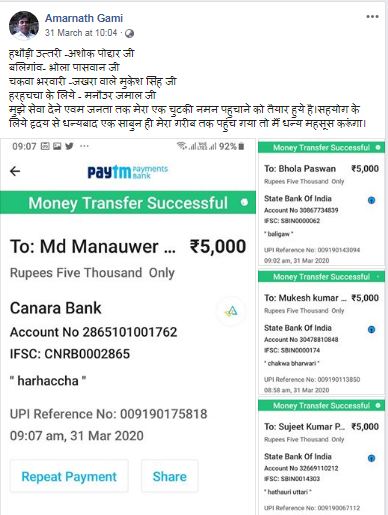 एहन में हायाघाट के विधायक अमरनाथ गामी अपन क्षेत्र के लोक लेल पहिल दिन सँ लागल छथि। अपन विधानसभा क्षेत्र के हरेक पंचायत में अपन क्षमतानुसार प्रति पंचायत (5000रु.) पाँच हजार टका साबून आ सैनिटाइजर लेल पठेलन्हि आ सतत अपन क्षेत्र के लोक सँ समन्वय में छथि जे कोनो गरीब-मजबूर लोक भूखे नै रहथि।