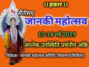 मैथिली लोक संस्कृति मंच लहेरियासराय दरभंगा के तत्वावधान में आयोजित जानकी जन्मोत्सव वंगालीटोला स्थिति कार्यालय में मनाया गया।जिस अवसर पर मां जानकी की पूजा मातृ शक्ति द्वारा संचालित की जाती है।पूजन गायन आरती बंदना की जाती है।दिन के ठीक 12 बजे जानकी नवमी को सीता जी की आरती “भय प्रगट कुमारी भुमि बिदारी