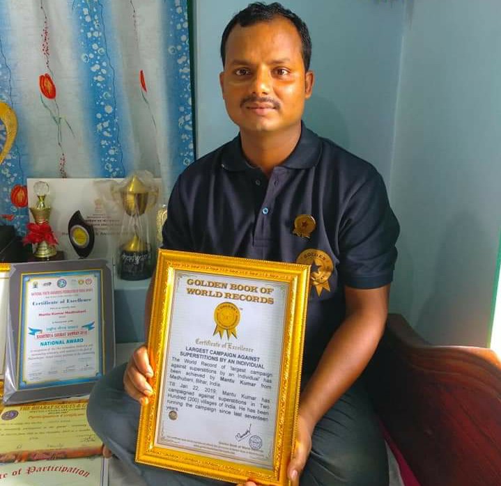 अंधविश्वासके खिलाफ देश भरिमे लगातार मुहिम चलोनिहार चिर परचित युवा मंटू कुमार मधुबनी जिला मुख्यालय जे•पी•कॉलोनी निवासी छथि। हुनक पिताजीक नाउ स्व0 रामभूषण मंडल अछि। हिनक प्रांरभिक शिक्षा सरकारी विद्यालय सँ भेल छैक। बचपन सँ मंटूजीके पढै़ लिखैयमे मोन कम विज्ञानक चमत्कार, खेल -कूद आ सांस्कृतिक कार्यक्रममे खूब लगैत रहय। हाई स्कूलमे भारत स्काउट और गाइड बिहार सँ जुड़लाह, ओतहि सँ प्रेरित भ केँ सामाजिक कार्यमे बढ़ि चढ़िके हिस्सा लिय लगलाह। स्नातक पास केला उपरांत नेहरू युवा केन्द्र मधुबनी सँ जुड़लाह आओर अंधविश्वास, बालश्रम, बाल विवाह, दहेज प्रथा ,वृक्षारोपण ,सामाजिक कुरीति आदि पर लगातार अभियान चलबैय लागलाह। श्री मंटू कुमार एकटा होनहार युवा छथि। अपन प्रतिभा सँ दुनियाकें परिचय करौलनि, मधुबनी जिलाक नाम रौशन देश भरिमे नहि अपितु विदेशोंमे सेहो केलाह। मंटू जी सँ हमर ( एहि पांतिक लेखक) पहिल मुलाकात नेहरू युवा केन्द्र संगठन मधुबनीमे भेल छल। मंटू जी कहै छैथि हुनक पिताजी स्व• रामभूषण मंडल ज्योतिषी छलाह, औठीपत्थल आदि बेचैत छलैक, हुनकर विरोध मंटू स्वयं करैत रहैक। ओ तंत्र मंत्रमे भारी श्रद्धा आओर विश्वास रखैत छलाह। एक दिन हुनक बाबूजी सपना देखलनि जे लौटरी केर टिकट खरीदने ओ धनवान भऽ जेताह। हुनका लौटरीक नशा एतेक चढ़ि गेल जे रसे-रसे हुनक पुश्तैनी जमीन जथा धरि बिका गेलैक। मुदा अंतमे परिवारक सदस्य केँ खाए तक प’ आफत भ गेलैक। ई विपिनताक घटना मंटू जी केँ भितर सँ झकझोइर देलकैक। वो संकल्प केलाह जे अंधविश्वासक विरुद्ध लड़ब आ आवाज़ जोरदार ढंगे उठाएब।