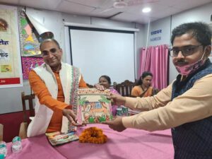 मंच के कलाकारगण द्वारा जूट पर मिथिला पेंटिंग सँ सजाकय बनाओल गेल बैग आ पर्स ई. गजेंद्र झा जी के उपहारस्वरूप प्रदान कयल गेल आ एहि तरहक बनल आर सब समान के ब्राँडिंग लेल गजेंद्र जी कलाकारगण के सतत सहयोग के आश्वासन देलन्हि।