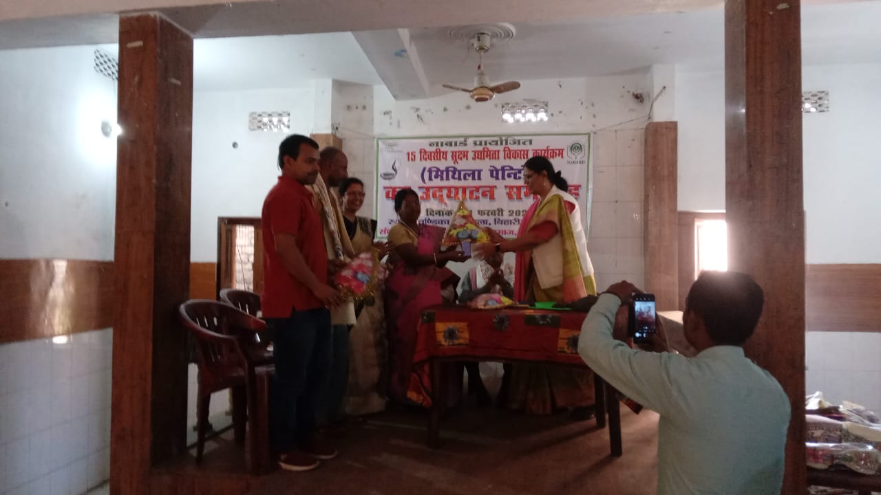 दिनांक 11फरवरी 2023 के मंडन भारती जागृति समाज , सहरसा द्वारा नाबार्ड प्रायोजित सुक्ष्म उद्यमिता विकास कार्यक्रम (MEDP) के अंतर्गत 15दिवसीय मिथिला पेंटिंग प्रशिक्षण के उद्घाटन, चंडिका धर्मशाला सभागार, बिहारीगंज में नाबार्ड के मधेपुरा एवं पूर्णिया के विकास पदाधिकारी द्वारा कयल गेल। उद्घाटन सत्र के संबोधित करैत डीडीएम नाबार्ड समुहक महिलालोकनि के कहलथि मिथिला पेंटिंग के प्रशिक्षण अपन संस्कृति के सुरक्षा संगहि आर्थिक उपार्जन हेतु महत्वपूर्ण अछि। संस्थाक सचिव लाजवंती झा कहलथि कि मिथिला पेंटिंग न केवल आर्थिक उपार्जनक स्रोत अछि अपितु महिलालोकनि द्वारा स्थानीय उत्पाद के, हथकरघा के बढ़ावा भेटबाक एकटा मुख्य रास्ता अछि। एहि प्रशिक्षण शिविर मे मैथिल मंच के प्रशिक्षित कलाकारगण द्वारा प्रशिक्षण देल जा रहल अछि।
