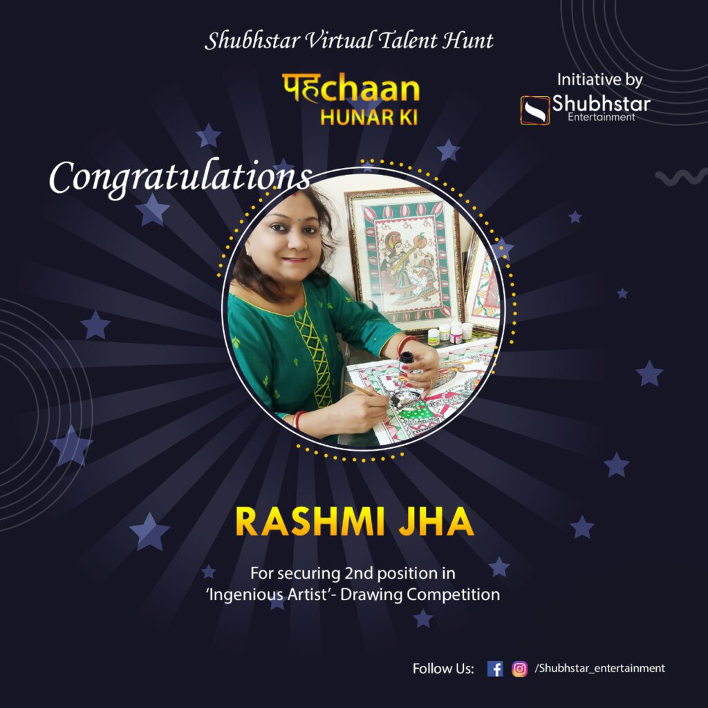मिथिला पेंटिंग के नामी कलाकार मुक्ति झा सं औनलाइन मिथिला पेंटिंग शिक्षा प्राप्त क क फेसबुक पर एक टा पेज “रश्मि झा मिथिला आर्ट गैलरी” के नाम स स्वरोजगार क अहि क्षेत्र में अप्पन अलग पहचान बना रहल छी।हाल में ही एक टा पेंटिंग प्रतियोगिता में मिथिला पेंटिंग बना क हम दोसर स्थान प्राप्त केलौं।